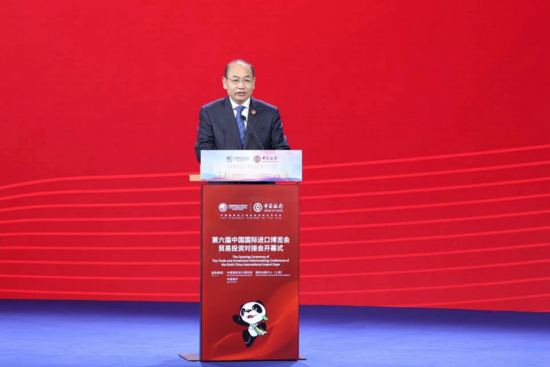 On November 6, Qiu Xiaoping, vice chairman of All-China Federation of Industry and Commerce (ACFIC), attended and delivered a speech at the opening ceremony of the Trade and Investment Matchmaking Conference of the 6th China International Import Expo (CIIE), which was co-organized by China International Import Expo Bureau, National Exhibition and Convention Center (Shanghai) and Bank of China. Vice Minister Sheng Qiuping delivered a video speech. Hua Yuan, vice mayor of Shanghai, Liu Jin, president of Bank of China, Ceferino S. Rodolfo, undersecretary of Department of Trade and Industry of the Philippines and managing head of the Board of Investment, and Veerapong Malai, director-general of the Office of Small and Medium Enterprises Promotion of Thailand, attended the opening ceremony and delivered speeches.